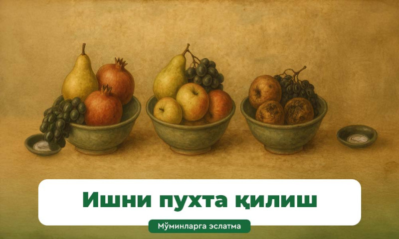 Энди биз ўз нафсларимиз билан холи қолиб, бир ўйлаб кўрайлик: Эртага қабримизда нима қиламиз? Доим эсингда тут! Ишни, амални пухта, чиройли қилиш ортида ажойиб натижалар бор. Шундай экан, амалингни пухта қилиб бажаришга интил! Зеро, Расулуллоҳ соллаллоҳу алайҳи васаллам: «Албатта, Аллоҳ сизлардан бирингиз бир амал қилганда, уни пишиқ, пухта қилиб бажаришини яхши кўради» деганлар.