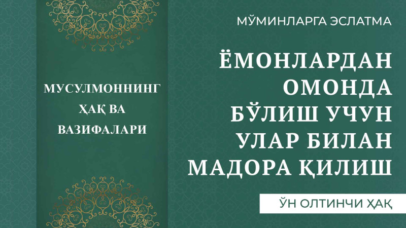 Ҳеч кимга қўл ва тил билан озор бермаслик. Мусулмон ўз номига муносиб равишда ҳар қандай озор беришдан сақланмоғи лозим.
