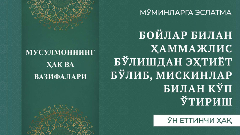 Бойлар билан ҳаммажлис улфат, яқин бўлишдан эҳтиёт бўлиб, мискинлар билан кўп ўтириш.Чунки ҳикмат ва ахлоқ китобларида бойлар, яъни молдавлати охиратларидан давоми...