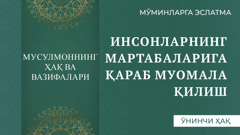 Одамларга ўз даражаларига қараб муомала қилиш.Гарчи дунёда қадр баланд бўлсада, шундай кишиларни жуда ҳурматлаб иззат кўрсатиш. Расулуллоҳ соллаллоҳу алайҳи давоми...