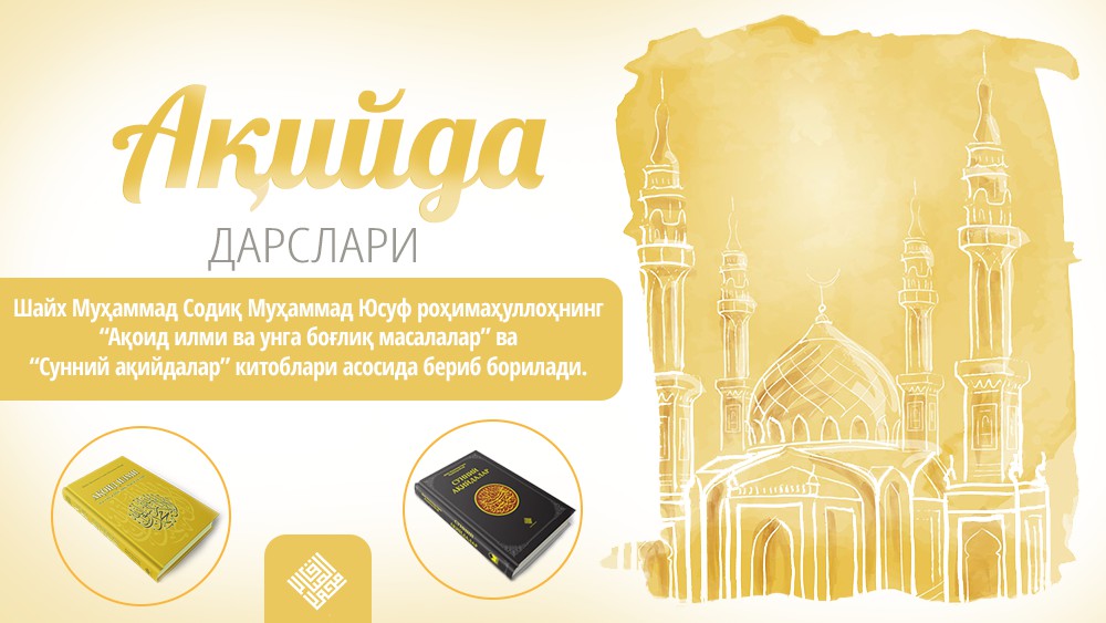 Ақийда дарслари Шайх Муҳаммад Содиқ Муҳаммад Юсуф роҳимаҳуллоҳнинг “Ақоид илми ва унга боғлиқ масалалар” ва “Сунний ақийдалар” китоблари асосида бериб борилади. Мавзуларнинг тўлиқ матни билан танишиш учун китобнинг ўзига мурожаат этиш тавсия этилади.
