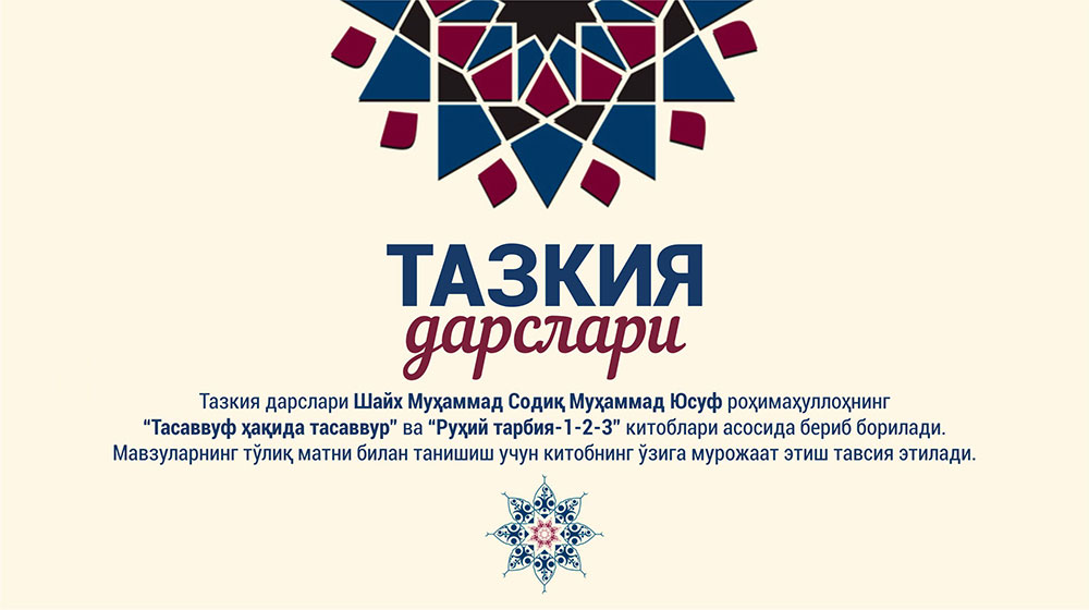 Тазкия дарслари Шайх Муҳаммад Содиқ Муҳаммад Юсуф роҳимаҳуллоҳнинг “Тасаввуф ҳақида тасаввур” ва “Руҳий тарбия-1-2-3” китоблари асосида бериб борилади. Мавзуларнинг тўлиқ матни билан танишиш учун китобнинг ўзига мурожаат этиш тавсия этилади.