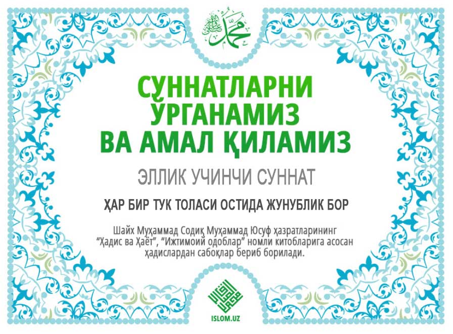 «Расулуллоҳ соллаллоҳу алайҳи васаллам айтдилар: «Ким Аллоҳ учун яхши кўрса, Аллоҳ учун ёмон кўрса, Аллоҳ учун берса ва Аллоҳ учун ман қилса, иймонни комил қилган бўлади».