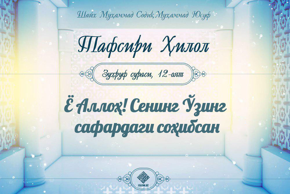 Ё Аллоҳ! Ўзинг бизга бу сафаримизни осон қилгин. Унинг узоғини яқин қилгин. Ё Аллоҳ! Сенинг Ўзинг сафардаги соҳибсан. Аҳли аёлдаги халифасан.