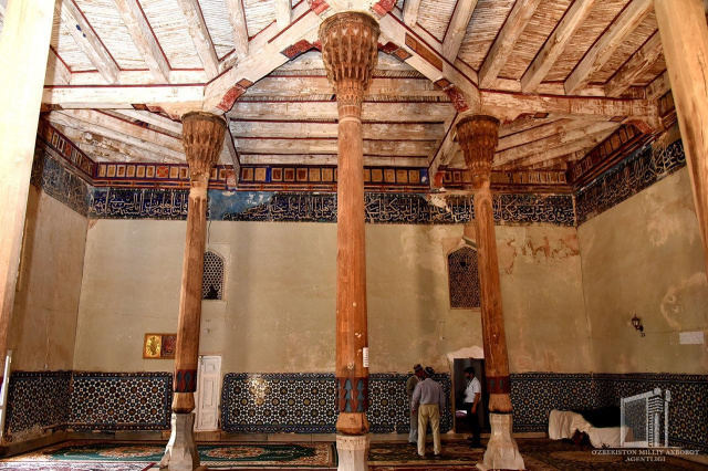 Масжид томининг баландлиги, пойдеворига қўйилган тошларнинг улканлиги, устун ва ёғочларнинг қучоққа сиғмаслиги уни ўта маҳобатли қилиб кўрсатади. Масжид катта хонақоҳининг устуни тепасида ҳижрий 1362 йил (милодий 1905 йил)да уста Муҳаммадиёр томонидан таъмирлангани ёзилган. Масжид баландлиги 11 метр, бўйи ва эни 32 метрдан. Масжид шифтига вассажуфт тахланган. Унинг меҳроб қисми нозик дид ва юксак маҳорат билан безатилган.