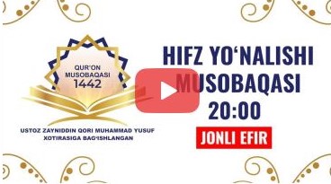 Бугун «Ҳифз йўналиши» бўйича мусобақа ўтказилади. Мусобақа соат 20:00 да AzonTV онлайн телеканалининг ижтимоий тармоқларида жонли тарзда намойиш этилади.