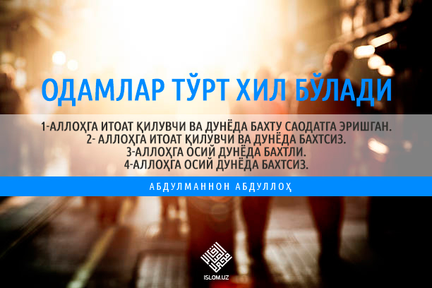 1Аллоҳга итоат қилувчи ва дунёда бахту саодатга эришган. 2 Аллоҳга итоат қилувчи ва дунёда бахтсиз. 3Аллоҳга осий дунёда бахтли. 4Аллоҳга осий дунёда бахтсиз. давоми...