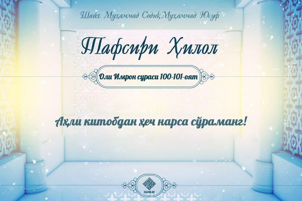 Эй иймон келтирганлар! Агар китоб берилганлардан бир гуруҳига итоат қилсангиз, иймонингиздан кейин сизни кофир ҳолга қайтарадир. (Оли Имрон сураси, 100-оят).