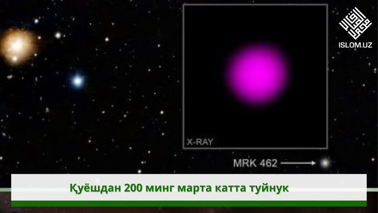 Ушбу бинафша рангида товланиб турган осмон жисми Mrk 462 галактикасидаги энг кичик супермассив қора туйнукдир. Пасдаги расм эса «NASA»нинг рентген нурланишда космик жисмларни ўрганувчи ва тасвирга олувчи космик расадхона бўлмиш «Чандра» телескопи.