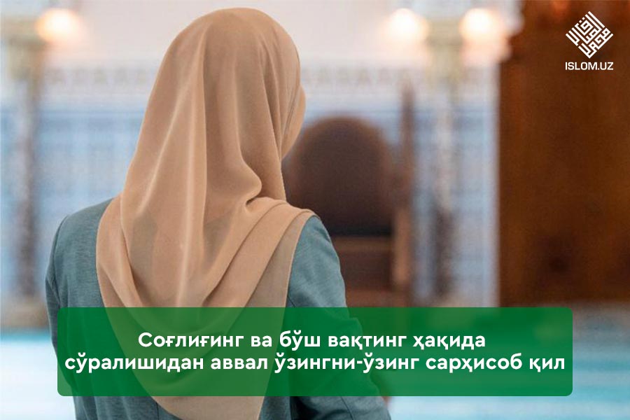 Энди ўзлигингга қайт, сен бу умматнинг қизисан. Умматни сақлаб қолишда ҳаракатлантирувчи кучлардан бирисан. Отанг ва онангга дўзахдан нажот берувчи сабабсан. Худди жаннат калитидексан. Уч эркак битта аёлдир. Барча бу хусусиятларингни инобатга олган ҳолда, ушбу икки неъматга нисбатан муносабатингни тўғирлаб ол. Соғлиғинг ва бўш вақтинг ҳақида сўралишидан аввал ўзингни-ўзинг сарҳисоб қил. Алданганларданмисан ёки алданишга қарши турувчи огоҳларданмисан?
