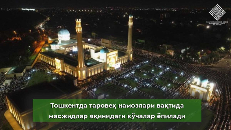 Тошкент шаҳар ИИББ хабарига кўра, Рамазон ойи кечаларидаги таровеҳ намозлари муносабати билан ҳар куни 19:00 дан 24:00 га қадар масжидлар яқинидаги йўллар транспорт воситалари ҳаракати учун беркитилади.