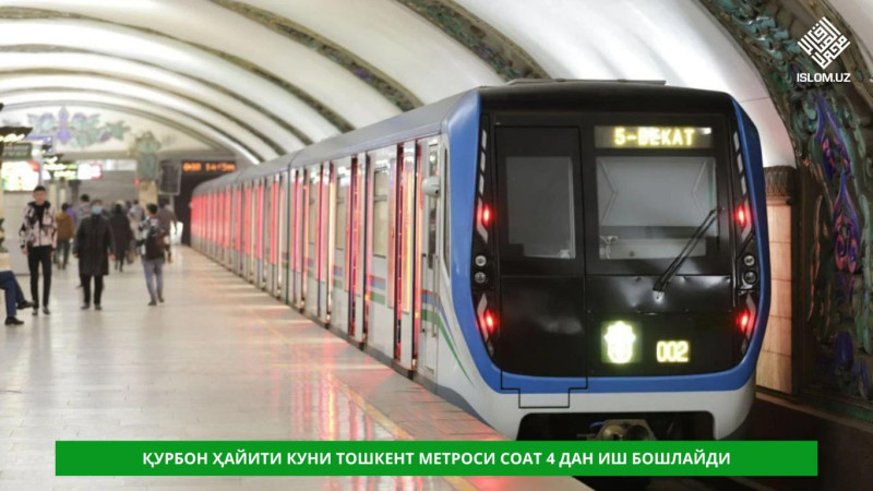 2023 йил 28 июнь — Қурбон Ҳайити байрами куни йўловчиларга қулайлик яратиш мақсадида Тошкент метрополитени тонги соат 04:00 дан кеч соат 00:00 га қадар доимий жадвал асосида ўз иш фаолиятини олиб боради.