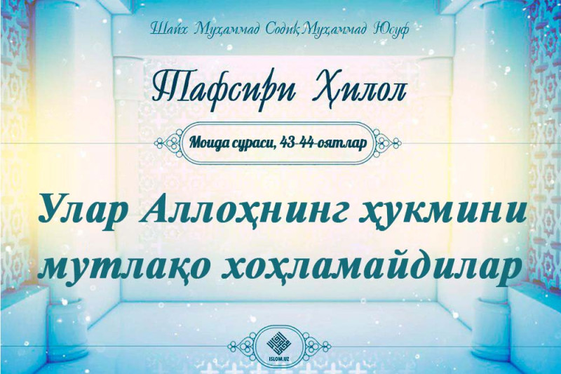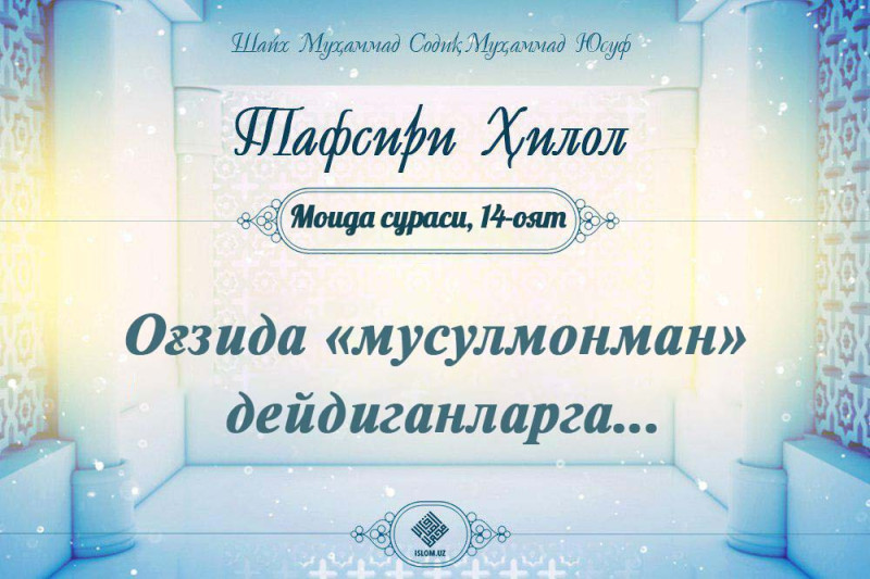 «Эй аҳли китоблар! Батаҳқиқ, Расулимиз сизларга китобдан беркитиб юрган кўпгина нарсаларингизни ўзингизга баён қилиб, кўпини афв қилувчи бўлиб келди».