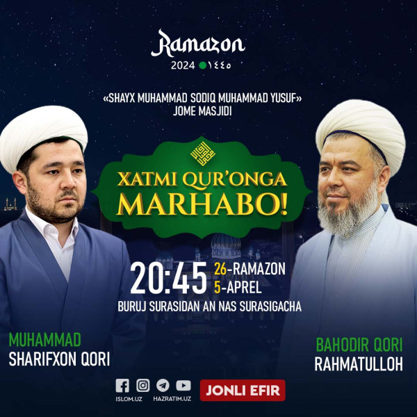 Барча азизларимизни қориларимизнинг гўзал тиловатларидан баҳраманд бўлишга, Қуръони Карим хатмининг якунини биргаликда тинглаб, хатми Қуръон дуосида ҳозир бўлишга таклиф қиламиз.