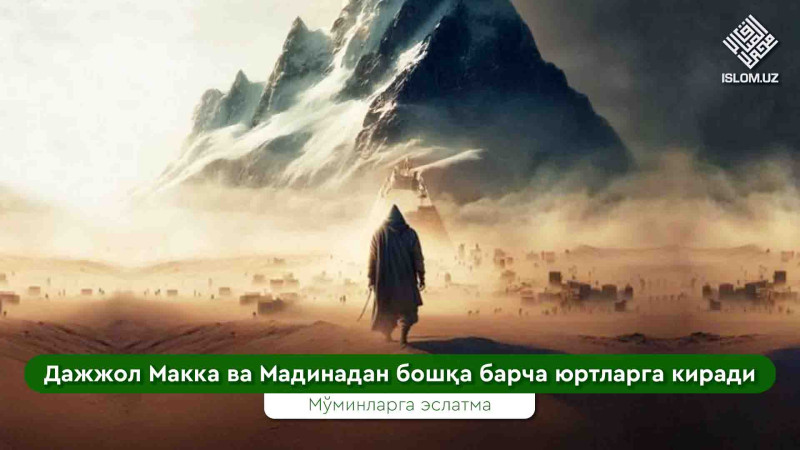 «Набий соллаллоҳу алайҳи васаллам шундай дедилар: «Дажжол Макка билан Мадинадан бошқа ҳар бир юртни албатта оёқости қилади. Иккисининг ҳар бир йўлини фаришталар саф бўлиб қўриқлайдилар. Шунда у тузли ерга тушади. Кейин Мадина уч марта титрайди, ундан барча кофир ва мунофиқлар у (Дажжол) томонга чиқади».