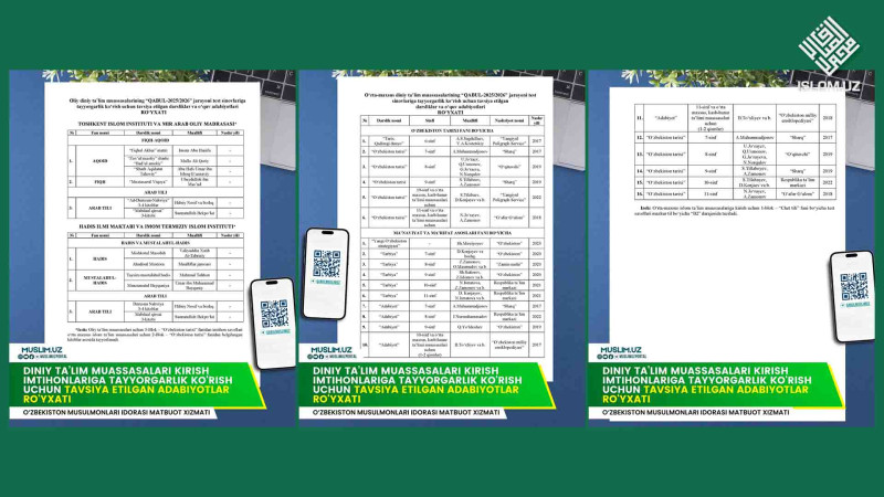 2025-2026 ўқув йилида Ўзбекистон мусулмонлари идораси тасарруфидаги олий ва ўрта махсус ислом таълим муассасаларига кириш тест синовларига тайёргарлик кўриш учун тавсия этилган дарслик ва адабиётлар рўйхатиг эълон қилинди.