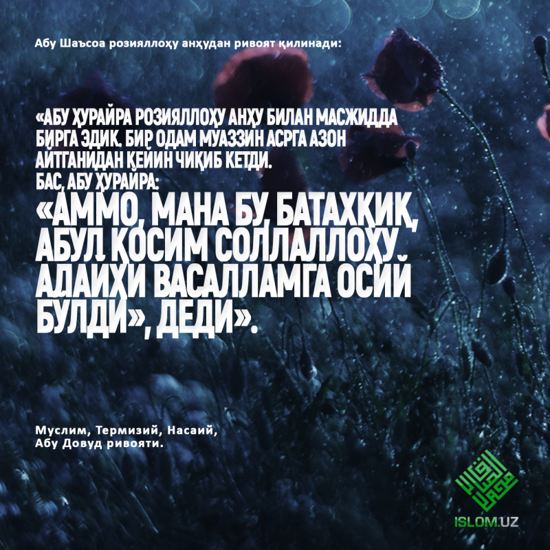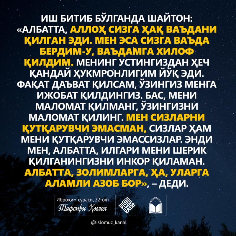 Бисмиллаҳир Роҳманир Роҳийм. Аллоҳ таолога битмас-туганмас ҳамду санолар бўлсин. Пайғамбаримизга мукаммал ва батамом салавоту дурудлар бўлсин.
