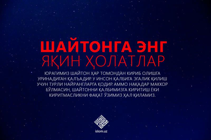 Юрагимиз шайтон ҳар томондан кириб олишга уринадиган қалъадир. У инсон қалбига эгалик қилиш учун турли найрангларга қодир. Аммо нақадар маккор бўлмасин, шайтонни қалбимизга киритиш ёки киритмасликни фақат ўзимиз ҳал қиламиз.