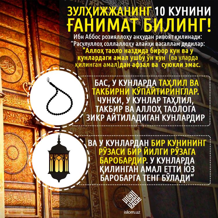 "Аллоҳ таоло наздида бирор кун ва у кунлардаги амал ушбу ўн кун (ва уларда қилинган амал)дан афзал ва суюкли эмас. Бас, у кунларда таҳлил ва такбирни кўпайтиринглар. Чунки, у кунлар таҳлил, такбир ва Аллоҳ таолога зикр айтиладиган кунлардир ва у кунлардан бир кунининг рўзаси бир йилги рўзага баробардир. У кунларда қилинган амал етти юз баробарга тенг бўлади”