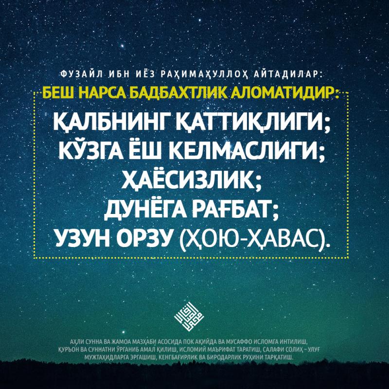 Бисмиллаҳир Роҳманир Роҳийм. Аллоҳ таолога битмас-туганмас ҳамду санолар бўлсин. Пайғамбаримизга мукаммал ва батамом салавоту дурудлар бўлсин.