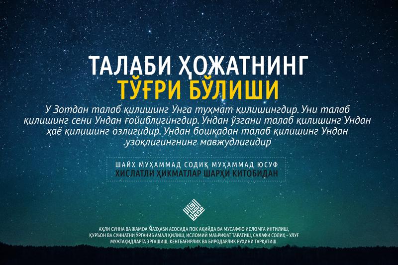 Банда ўзининг барча ҳожатларини фақатгина Аллоҳ таолонинг ёлғиз Ўзидан талаб қилиши керак. Агар шундай қилмаса, у банда Аллоҳ таолодан узоқлашган, У Зотни унутган ва У Зотдан жоҳил қолган бўлади.