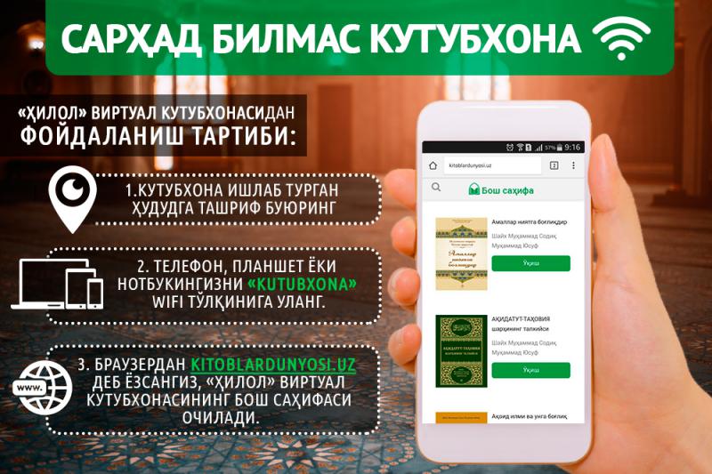 «Ҳилол-нашр» нашриёти ушбу қулай, инновацион лойиҳани китобсевар халқимизга туҳфа қилар экан, виртуал кутубхонани барча турдаги таълим муассасалари, масжид-мадрасалар ҳамда исталган жамоат жойларига ўрнатиб беришга тайёрлигини маълум қилади.
