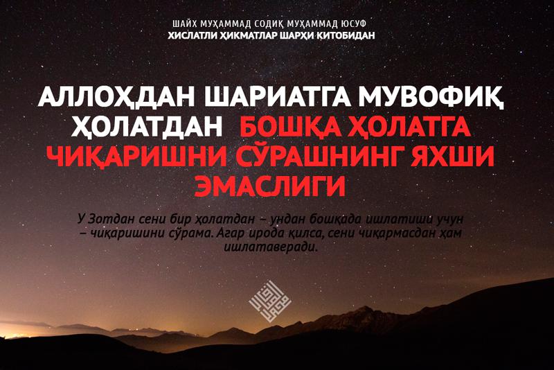 Аллоҳ таоло барчамизни У Зотдан ўзимизни шариатга мувофиқ ҳолатдан бошқа ҳолатга чиқаришини сўрашимиздан Ўзи асрасин!