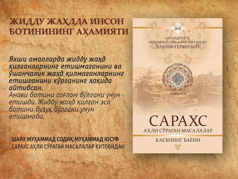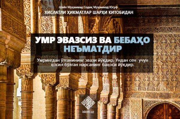 “Расулуллоҳсоллаллоҳуалайҳива саллам: “Бошқа инсонларнинг аёлларига нисбатан иффатли бўлинг. Аёлларингиз ҳам иффатли бўлурлар. Ота-оналарингизга яхшилик қилинг, фарзандларингиз ҳам сизларга яхшилик қилур”, дедилар.(Имом Муслим ривояти).