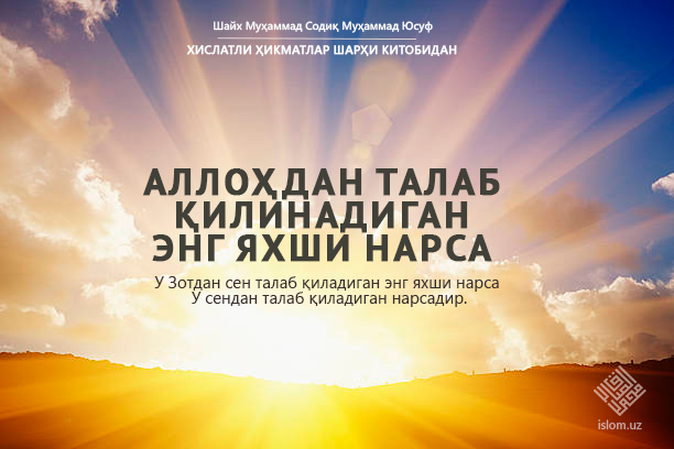 Ҳикоя. Абдуллоҳ ибн Муборак раҳимаҳуллоҳ айтадилар: «Қаҳатчилик қаттиқ бўлган йили Мaдинaи мунaввaрaга келдим. Одамлар истисқо (ёмғир сўраш) намозини ўқигани чиқишди. Мен ҳам улар билан чиқдим. Шунда қора танли бир қул келди. Унинг эгнида икки бўлак дағал канопдан тўқилган мато бўлиб, бирини лунги қилиб ўраб, иккинчисини елкасига ташлаб олган эди. У ёнимга келиб ўтиргач, мен унинг шундай деб дуо қилганини эшитдим: «Илоҳим, гуноҳлар ва ёмон амалларнинг кўплиги Сенинг ҳузурингда бизнинг юзимизни эскиртириб юборди. Бандаларингнинг адабини бериш учун осмон ёмғирини биздан тўсиб қўйдинг. Эй Ҳалим Зот! Бандаларинг Сенинг фақат яхшиликларингни билган. Мана шу соатдаёқ, мана шу соатдаёқ уларга ёмғир ёғдиргин». У «мана шу соатдаёқ, мана шу соатдаёқ» деган гапини тугатгани ҳам йўқ эдики, осмонни булут қоплаб, ҳар томондан ёмғир ёғиб юборди».