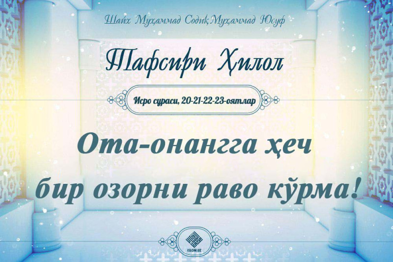 .Икковларига меҳрибонлик ила хокисорлик қанотингни пастлат ва .Роббим, алар мени кичикликда тарбия қилганларидек, давоми...
