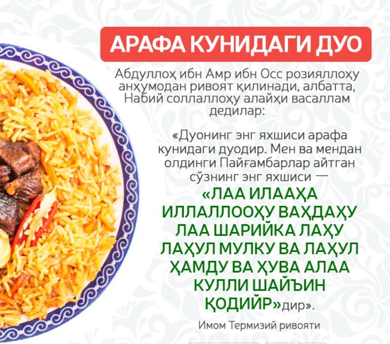 Абдуллоҳ ибн Амр ибн Осс розияллоҳу анҳумодан ривоят қилинадиАлбатта, Набий соллаллоҳу алайҳи васаллам дедилар .Дуонинг энг яхшиси арафа кунидаги дуодир. Мен ва давоми...
