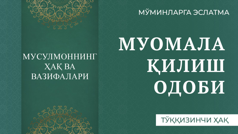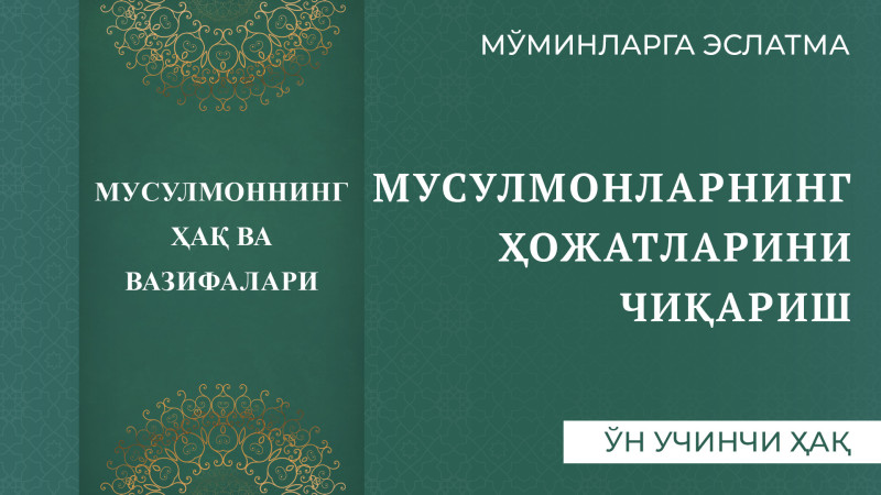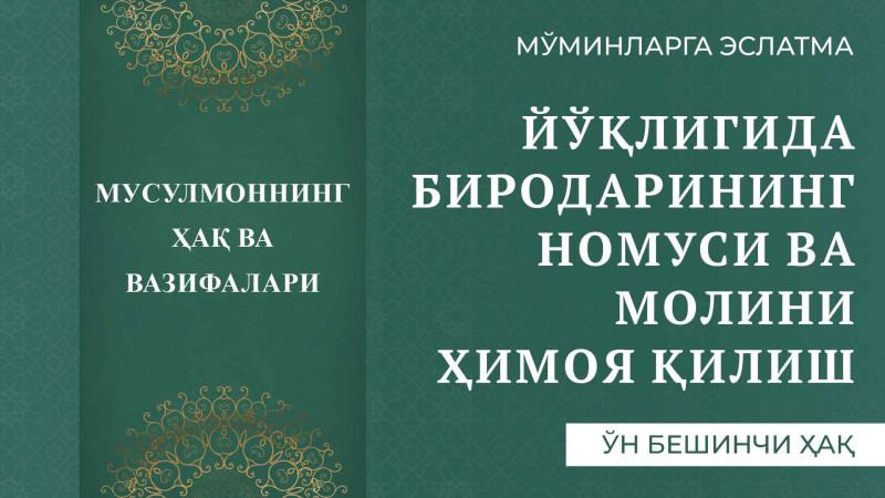 Йўқлигида биродарига ёрдам қўлини чўзиб, унинг номуси ва молини ҳимоя қилиш.Ҳадиси шарифда Бирор киши бир мусулмонга ndash уни обрўси топталиб, ҳурмати поймол давоми...