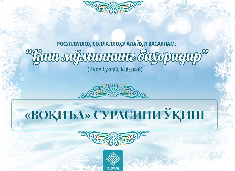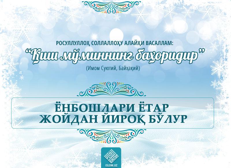 Қиш кунлари бир киприк қоққунча ўтиб кетади. Жуда ҳам қисқалиги сабаб кўп ишларга улгурмай ҳам қоламиз. Аммо шу қисқа фурсатда қанча кўп савоб олиш имкони бўлса, давоми...