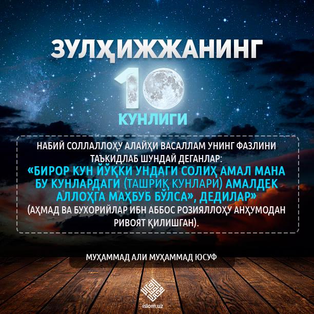 Зулҳижжанинг биринчи ўн кунлиги улуғ фазилатларга эга. Бу ой ҳаром ойлардан бири саналади. Унда ҳаж ибодати бажарилади. Унда ҳажнинг энг катта рукни бўлмиш давоми...