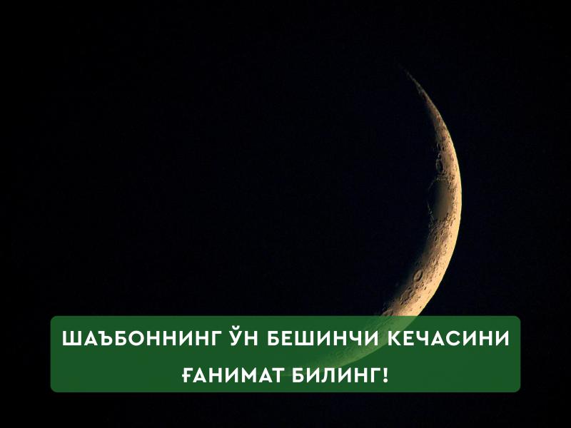 Али розияллоҳу анҳудан ривоят қилинади .Шаъбоннинг ўртасидаги кеча келса, унинг тунини бедор ўтказинглар, кунининг рўзасини тутинглар. Чунки ўшанда Аллоҳ қуёш давоми...