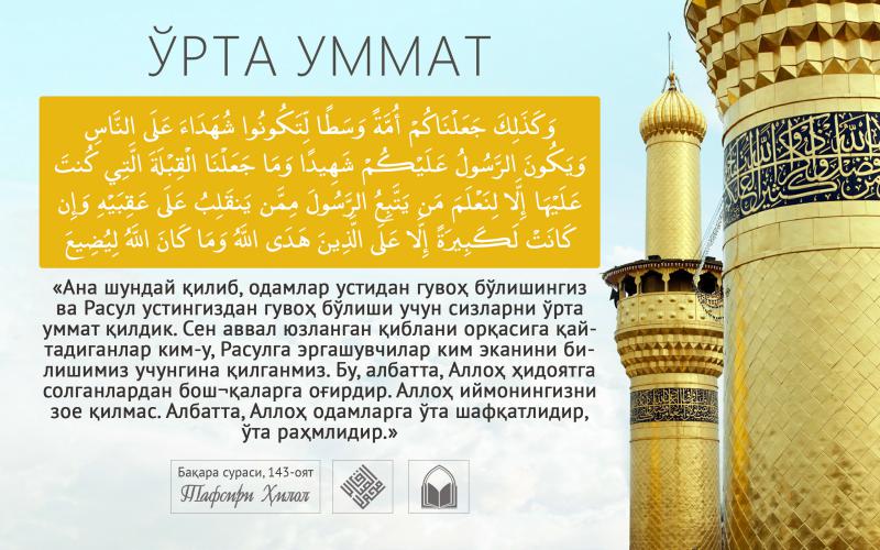 .Ана шундай қилиб, одамлар устидан гувоҳ бўлишингиз ва Расул устингиздан гувоҳ бўлиши учун сизларни ўрта уммат қилдик. Сен аввал юзланган қиблани орқасига давоми...