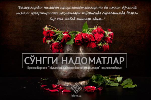 quotБеморлардан нимадан афсусланаётганларини ва имкон бўлганда нимани ўзгартиришни хоҳлашлари тўғрисида сўраганимда деярли бир хил жавоб эшитар эдим...quotБу давоми...