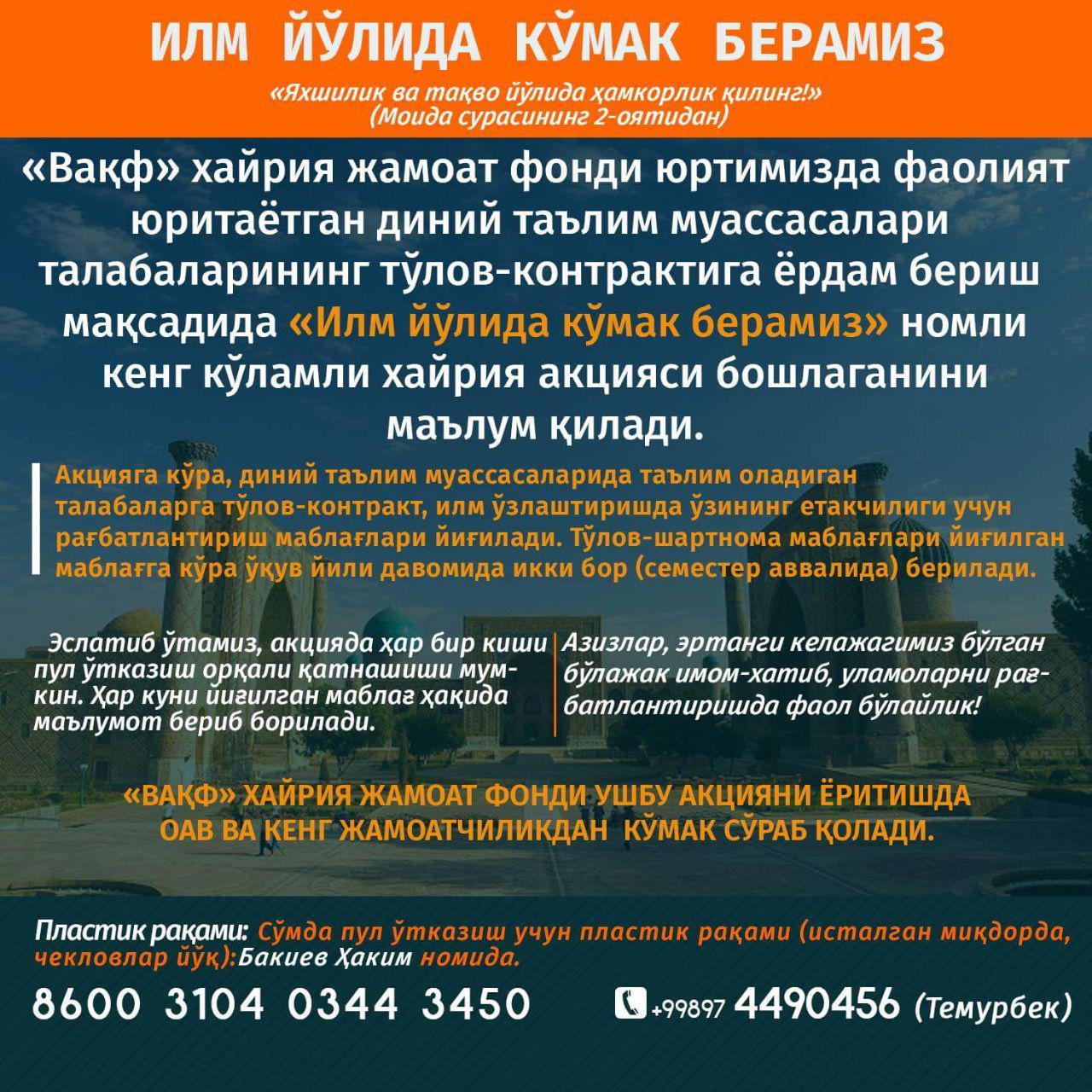 Вақф хайрия жамоат фонди диний таълим муассасалари талабалари учун махсус акция эълон қилади.Яхшилик ва тақво йўлида ҳамкорлик қилинг, Моида сурасининг 2 давоми...