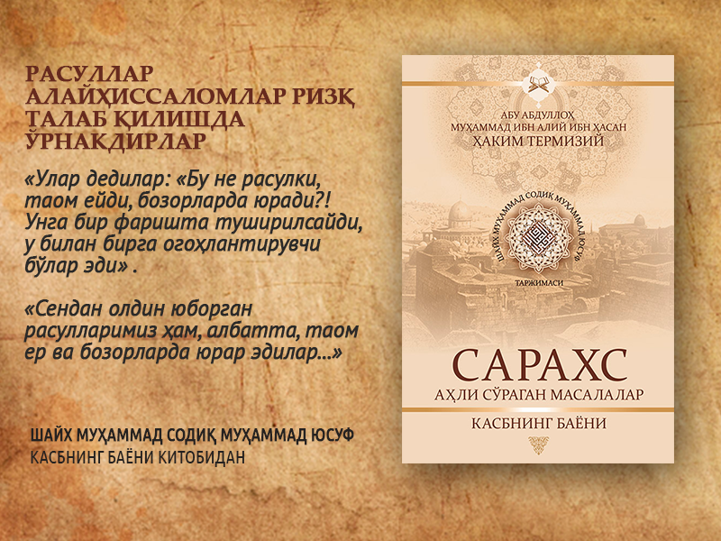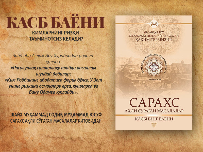 Кимларнинг ризқи таъминотсиз келади Муслим ибн Жубайр Абу Ҳурайрадан ривоят қилади.Расулуллоҳ соллаллоҳу алайҳи васаллам шундай дедилар.Аллоҳнинг Бану Одамнинг давоми...