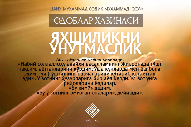 Набий соллаллоҳу алайҳи васаллам.Албатта, Аллоҳ қиёмат куни бандани Ўзига яқинлаштиради. Ҳаттоки, елкасини унинг устига қўяди ва .Бу гуноҳни биласанми, бу гуноҳни давоми...