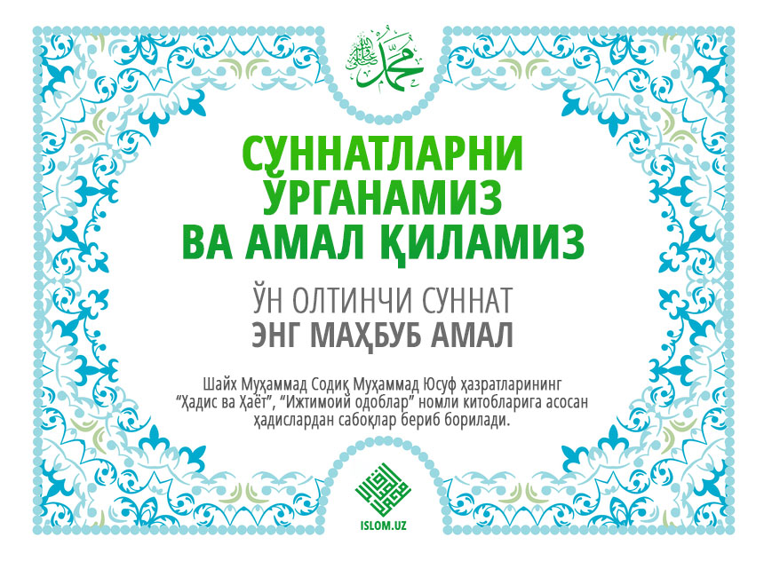 Оиша розияллоҳу анҳодан ривоят қилинади.Расулуллоҳ соллаллоҳу алайҳи васалламдан .Қандай амал Аллоҳ учун энг маҳбубдир,, деб сўралди. .Оз бўлса ҳам, давомлиси,, давоми...