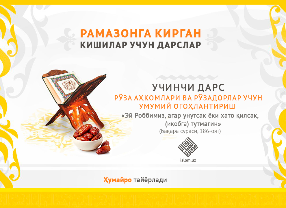 Рўза аҳкомлари ва рўзадорлар учун умумий огоҳлантиришКўз эгаларига ибрат бўлиши учун тунни кунга алиштириб қўйган Аллоҳга ҳамдлар бўлсин. Кенгчилик неъмати учун давоми...